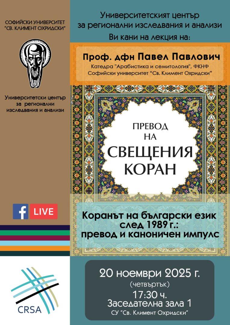 Лекцията ще се проведе от 17:30 ч. на 20 ноември 2025 г. (четвъртък) в Заседателна зала 1 в Ректората на СУ “Св. Климент Охридски”.